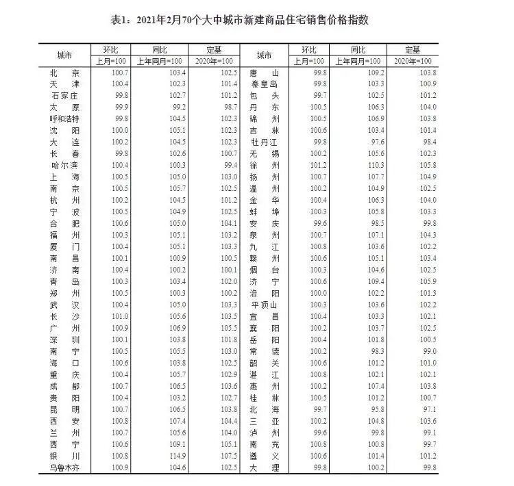 表1:2021年2月70個大中城市新建商品住宅銷售價格指數