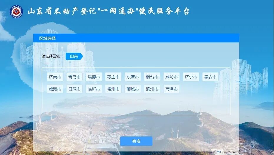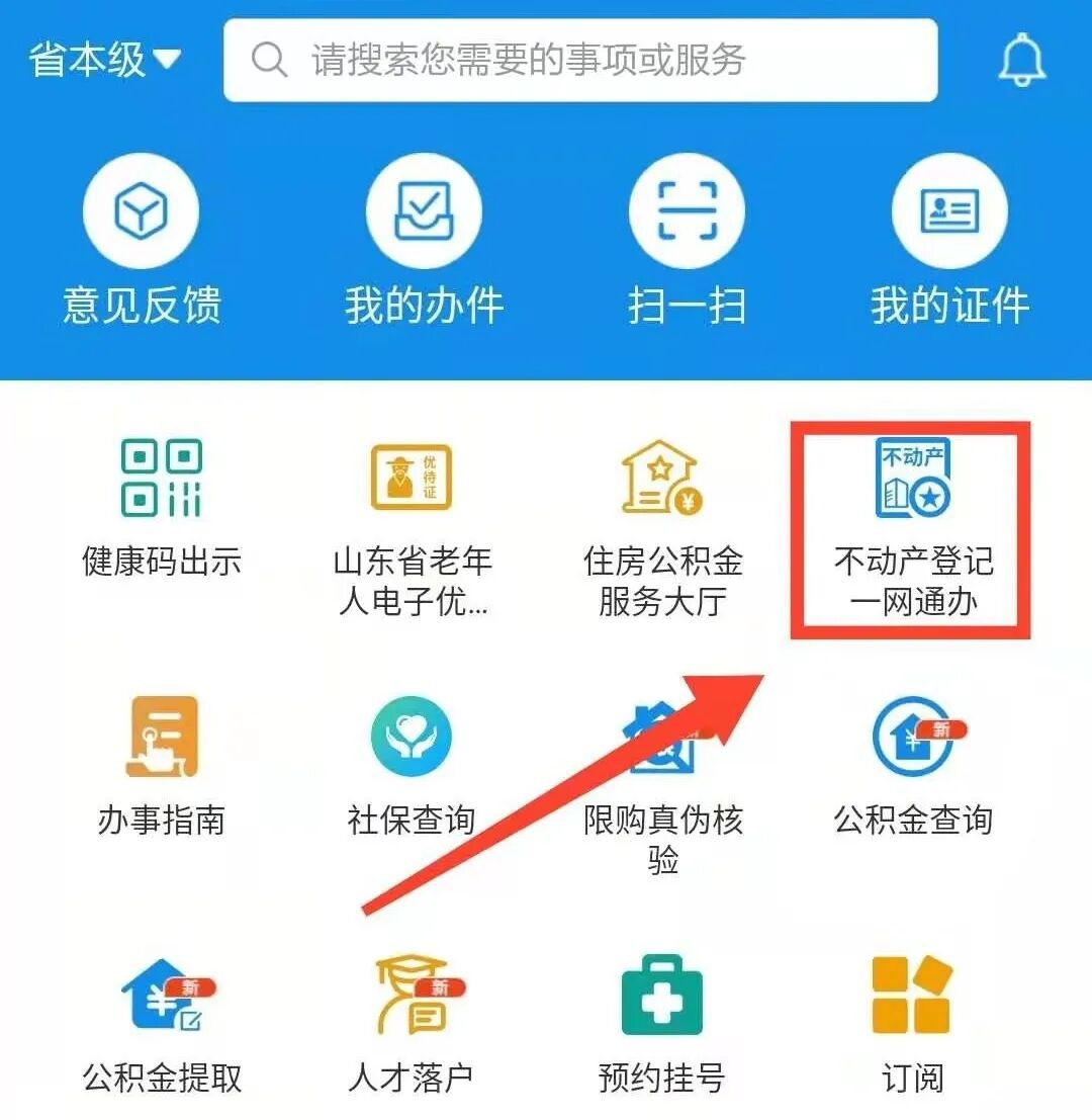 1.打開“愛山東APP”,點擊首頁“不動產登記一網通辦”,并選擇不動產所屬市縣;