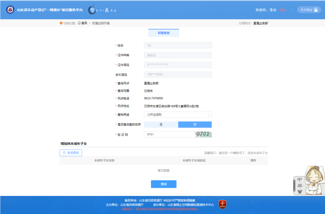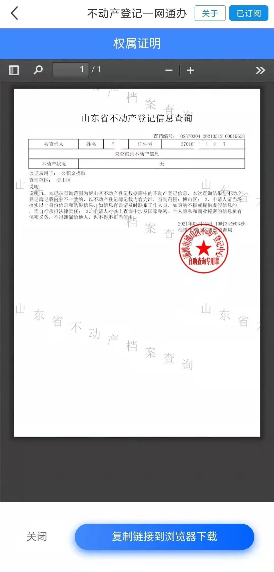 5.填寫驗證碼后,點擊查詢,系統會自動生成加蓋電子印章的不動產查詢記錄(PDF格式),申請人可以查看權屬證明、復制到瀏覽器下載使用。