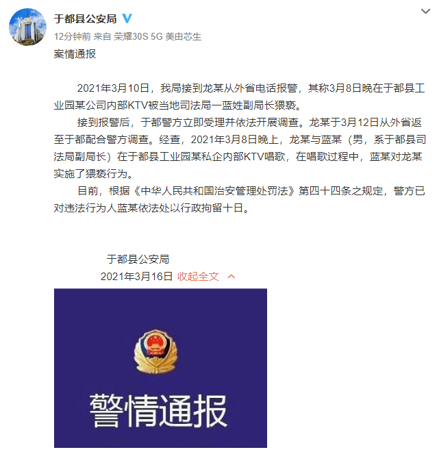接到報警后,于都警方立即受理并依法開展調查。龍某于3月12日從外省返至于都配合警方調查。經查,2021年3月8日晚上,龍某與藍某(男,系于都縣司法局副局長)在于都縣工業園某私企內部KTV唱歌,在唱歌過程中,藍某對龍某實施了猥褻行為。