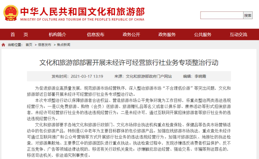 文化和旅游部要求各地文化和旅游行政部門、文化市場綜合執法機構重點檢查保險、保健品等各類市場營銷活動中的包價旅游產品,特別是以中老年為主要目標群體的包價旅游產品。加強在線旅游市場執法,重點查處未經許可通過互聯網推廣和公眾號營銷等方式開展旅行社業務的違法違規經營行為。加強對旅游團隊、地接社的執法檢查,對旅游集散地、主要景區中的旅游團隊進行重點執法。執法檢查過程中,發現涉嫌違反消費者權益保護、反不正當競爭、廣告等領域法律法規的,移送有關行政機關查處;涉嫌觸犯非法經營、強迫交易、詐騙等刑法罪名的,移送司法機關,依法追究刑事責任。