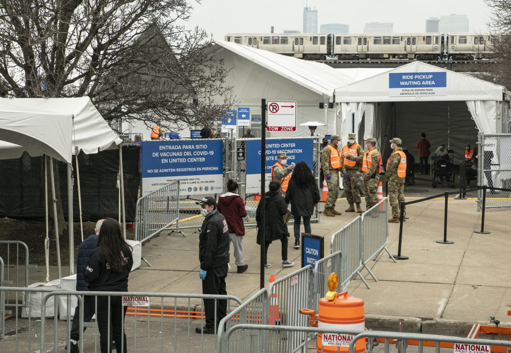 3月10日,在美國芝加哥,人們準備進入聯合中心球場新冠疫苗接種點。新華社發,喬爾·萊納攝)