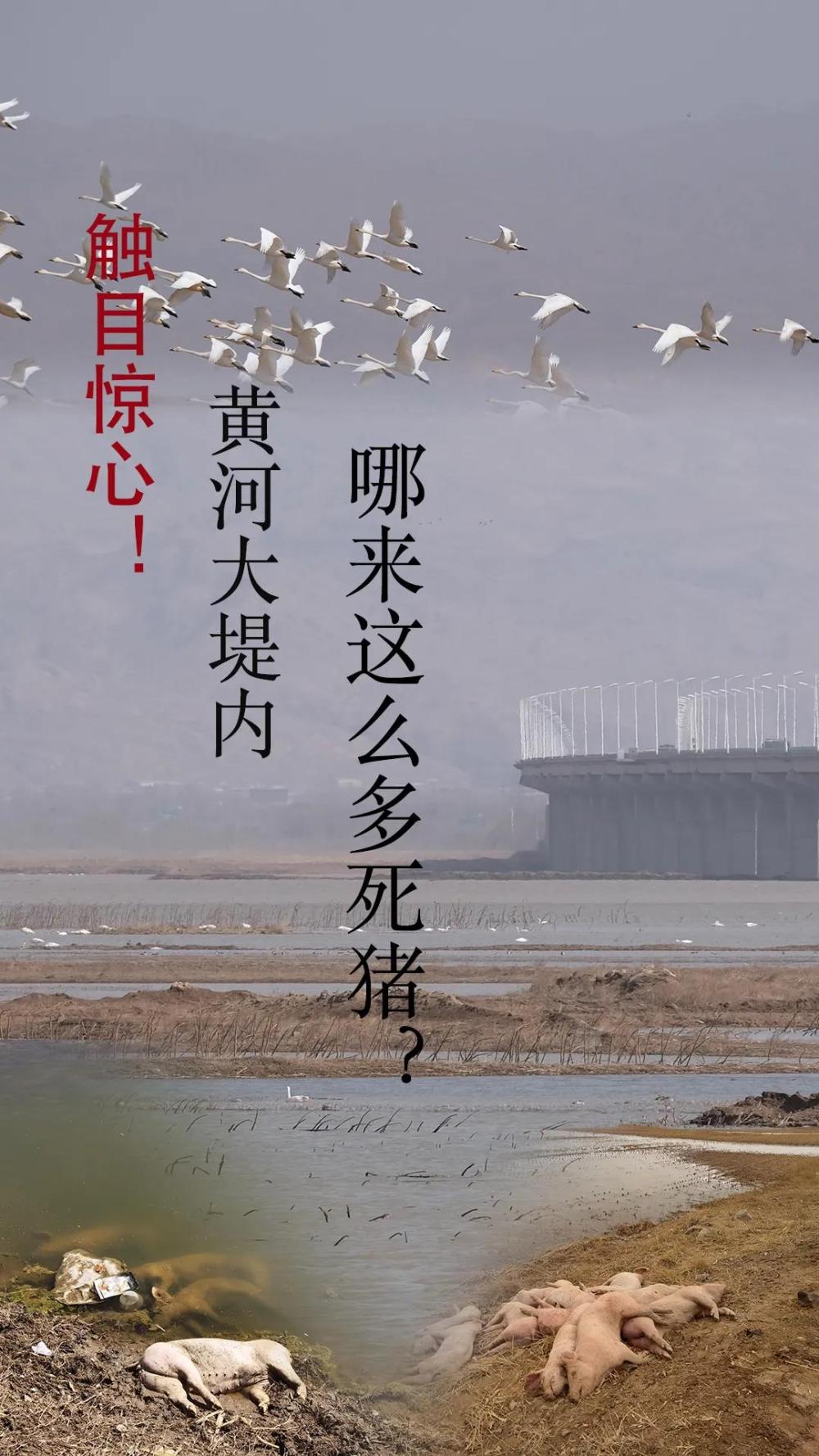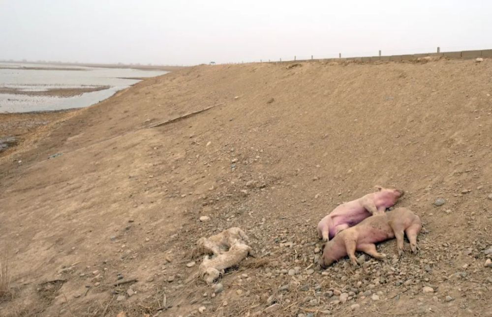 3月16日,記者在內蒙古西部的達拉特旗王愛召鎮境內沿黃河大堤拍攝候鳥時無意中發現,德勝營子村黃河“國堤”內側,通向主河道的土路下面,2頭死豬分外顯眼地橫尸水邊,其中1頭上半身浸泡在水里;再往前二三十米處,又有4頭死豬同樣泡在水邊。這些死豬看上去有一兩百斤,應是被人棄在這里的大豬尸體。