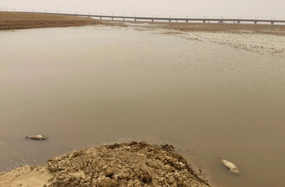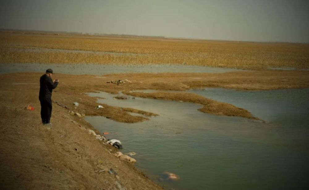 再向西不遠處,展旦召蘇木境內“國堤”內側的一個取水口處,2頭死豬泡在水中。遠處,天鵝、野鴨等成群候鳥或在水中覓食,或鳴叫著盤旋在上空。