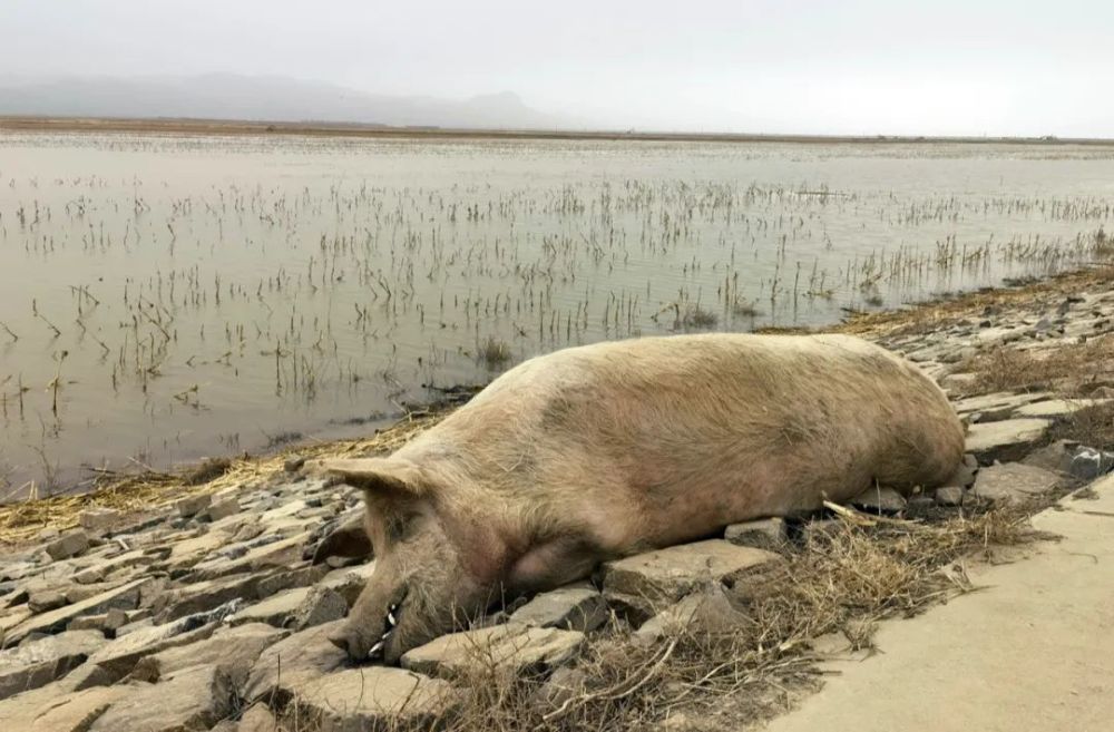 繼續沿“國堤”西行,在達拉特旗樹林召鎮境內的黃河大堤內側的石頭護坡邊上,1頭看上去有三四百斤的大豬“趴”在那里。走到跟前一看,獠牙外露,也是死豬。