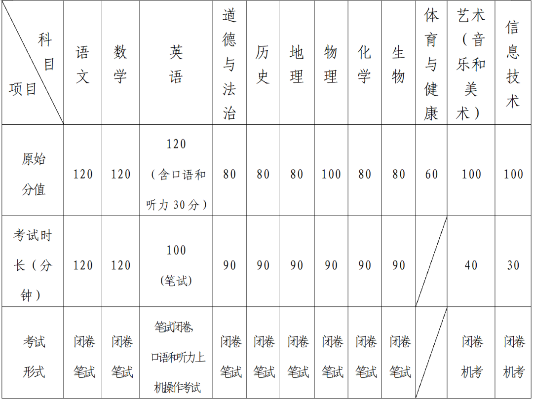 (二)2021年初中學(xué)業(yè)水平考試科目原始分值及考試時長