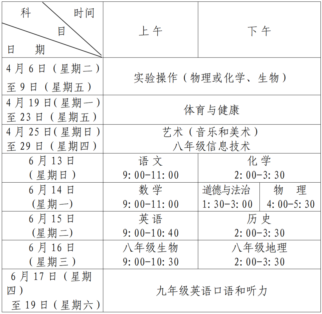 2021年初中學(xué)業(yè)水平考試科目與時間