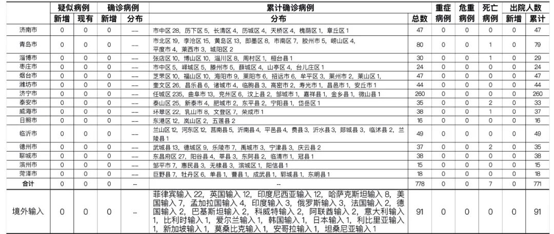 山東無新增境外輸入疑似病例、確診病例。累計報告境外輸入確診病例91例,治愈出院91例。