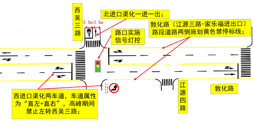 2、西進口借西向東信號燈桿增設禁止左轉標志及輔助標志,7:00-9:00及17:00-19:00時間段內敦化路西向北禁止駛入西吳三路;