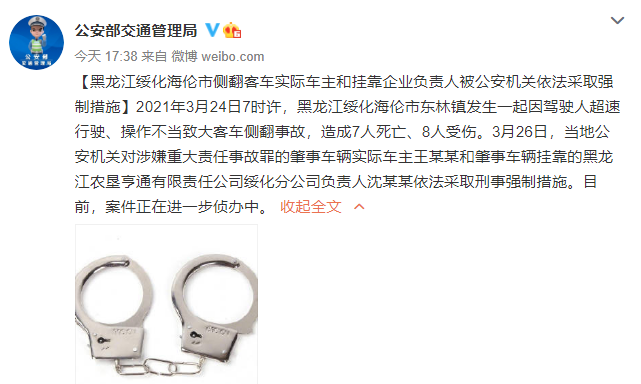 【黑龍江綏化海倫市側翻客車實際車主和掛靠企業負責人被公安機關依法采取強制措施】2021年3月24日7時許,黑龍江綏化海倫市東林鎮發生一起因駕駛人超速行駛、操作不當致大客車側翻事故,造成7人死亡、8人受傷。3月26日,當地公安機關對涉嫌重大責任事故罪的肇事車輛實際車主王某某和肇事車輛掛靠的黑龍江農墾亨通有限責任公司綏化分公司負責人沈某某依法采取刑事強制措施。目前,案件正在進一步偵辦中。