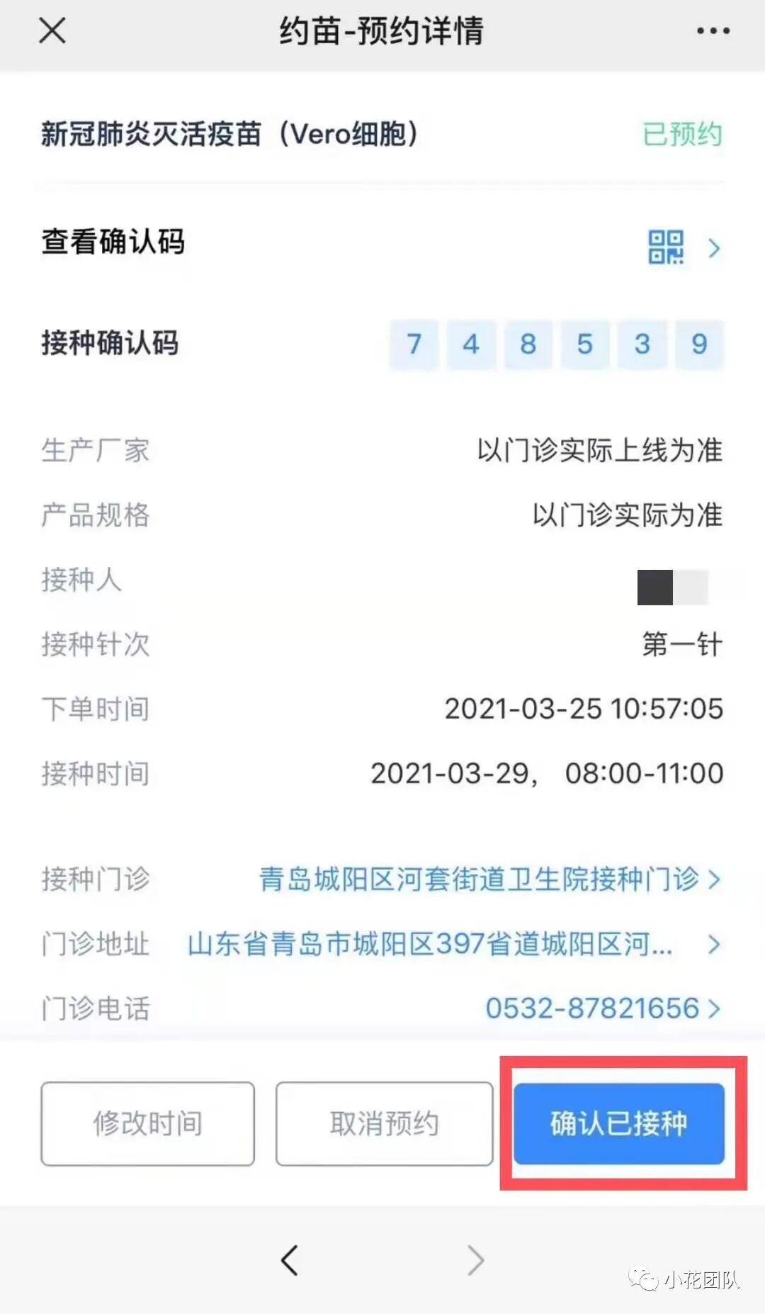 預約成功,點擊查看訂單即可查看預約詳情,如果信息填寫錯誤或者其他原因想要更改或取消預約,可以在預約詳情界面上選擇“修改時間”或“取消預約”,接種完成后點擊“確認已接種”。