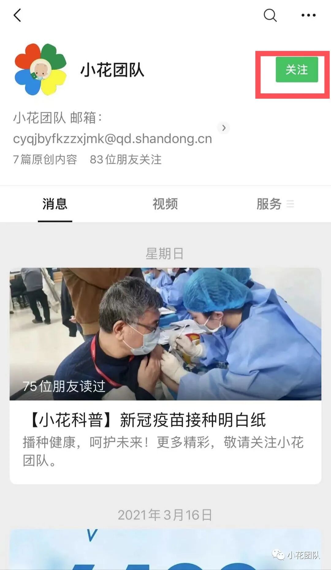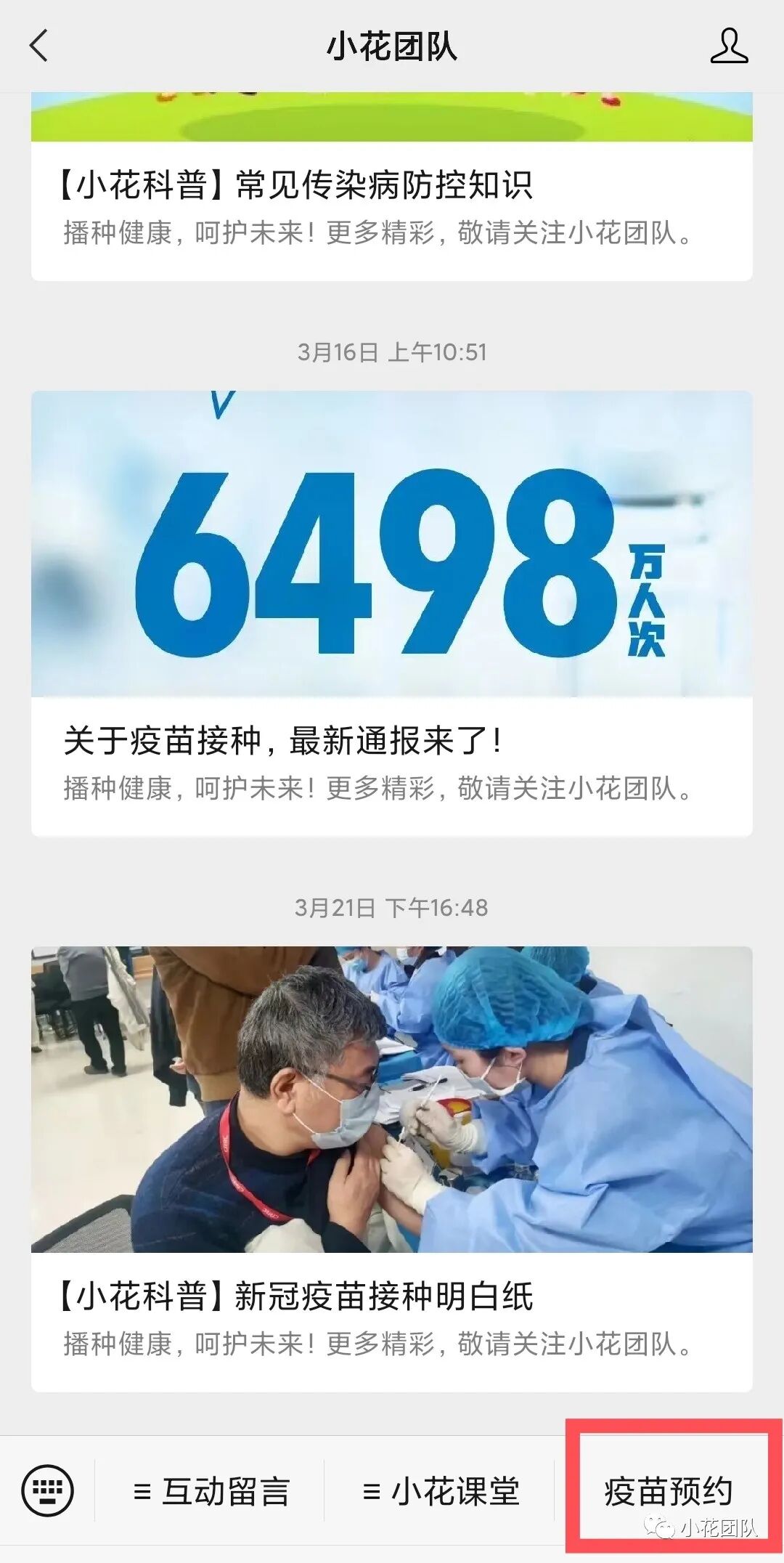 關注“小花團隊”公眾號,點擊右下角“疫苗預約”;
