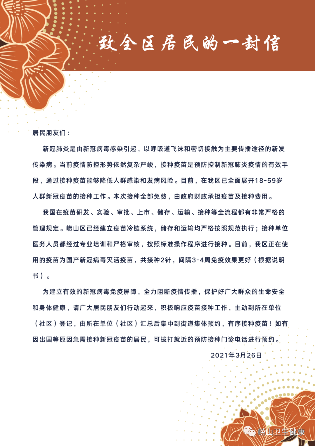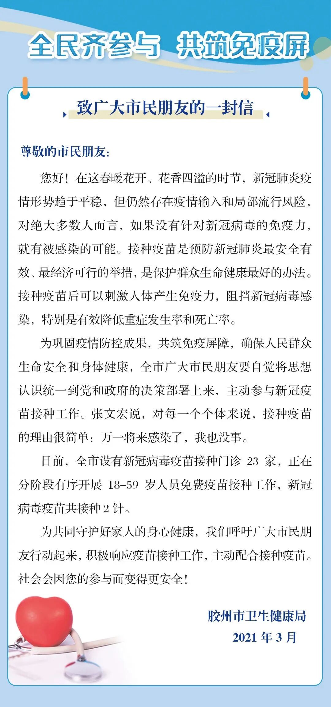 為給全市百姓建立起一道強大免疫屏障,為共同守護好家人的身心健康,我們呼吁廣大市民朋友行動起來,積極響應疫苗接種工作,主動配合接種疫苗。
