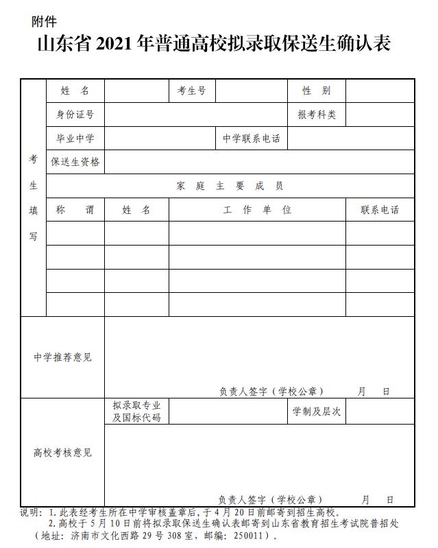 (四)被普通高校確定擬保送錄取的考生,須自行登錄山東省教育招生考試院網(wǎng)站(www.sdzk.cn)下載并填寫《山東省2021年普通高校擬錄取保送生確認表》1份(點擊文末“閱讀原文”,下載《確認表》),由所在中學填寫推薦意見后,于4月20日前將《確認表》郵寄到錄取高校。獲得多所高校擬錄取資格的考生只能確認1所錄取高校,因確認多所高校造成的遺留問題,由考生本人負責。