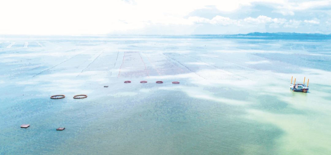 鳥瞰榮成愛倫灣海洋牧場(chǎng)。 青島日?qǐng)?bào)記者 柳棟攝