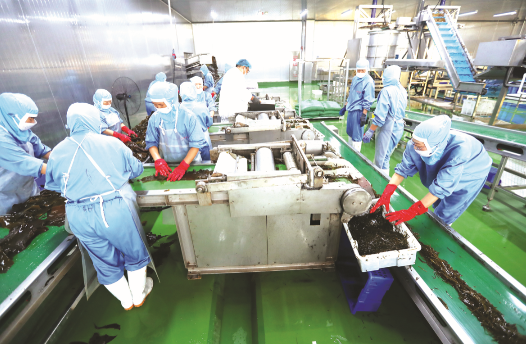 榮成蔚藍(lán)谷海洋科技產(chǎn)業(yè)園工人在加工海帶。 青島日?qǐng)?bào)記者 柳棟攝