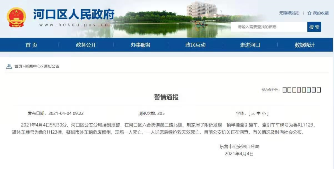 2021年4月4日5時30分,河口區公安分局接到報警,在河口區六合街道渤三路北側、荊家屋子附近發現一輛半掛牽引罐車,牽引車車牌號為魯RL1123、罐體車牌號為魯R1H23掛,疑似市外車輛危廢傾倒,現場一人死亡,一人送醫后經搶救無效死亡。目前公安機關正在調查,有關情況及時向社會公布。