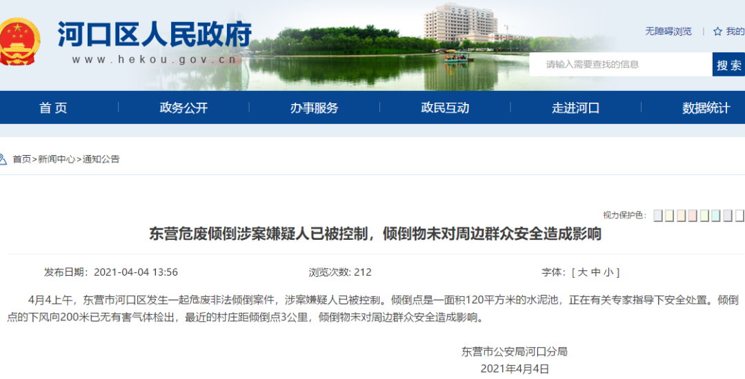 4月4日上午,東營市河口區政府網站發布警情通報。通報稱,轄區內發現有疑似市外車輛危廢傾倒,現場一人死亡,一人送醫后經搶救無效死亡。目前公安機關正在調查。