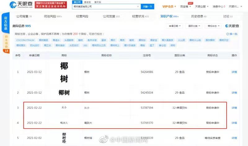 【椰樹集團申請國宴飲料相關商標被駁回】北京法院審判信息網4月5日公開了椰樹集團有限公司與國家知識產權其他一審行政判決書。判決書顯示,原告訴稱,“椰樹YeShu Coconut China State Banquet Beverage及圖”商標屬于原告的延伸性商標,可整體翻譯為“椰樹椰子中國國宴飲料”。法院認為,本案中,訴爭商標含有我國國家名稱“China”,指定使用在復審商品上,易使社會公眾產生不良影響,訴爭商標違反了《商標法》相關規定。本案裁判結果為駁回原告椰樹集團有限公司的訴訟請求。值得注意的是,根據天眼查商標信息,椰樹集團有限公司還于今年2月分別申請了“從小”“喝到大”商標,國際分類為啤酒飲料,商標狀態為“商標申請中”。