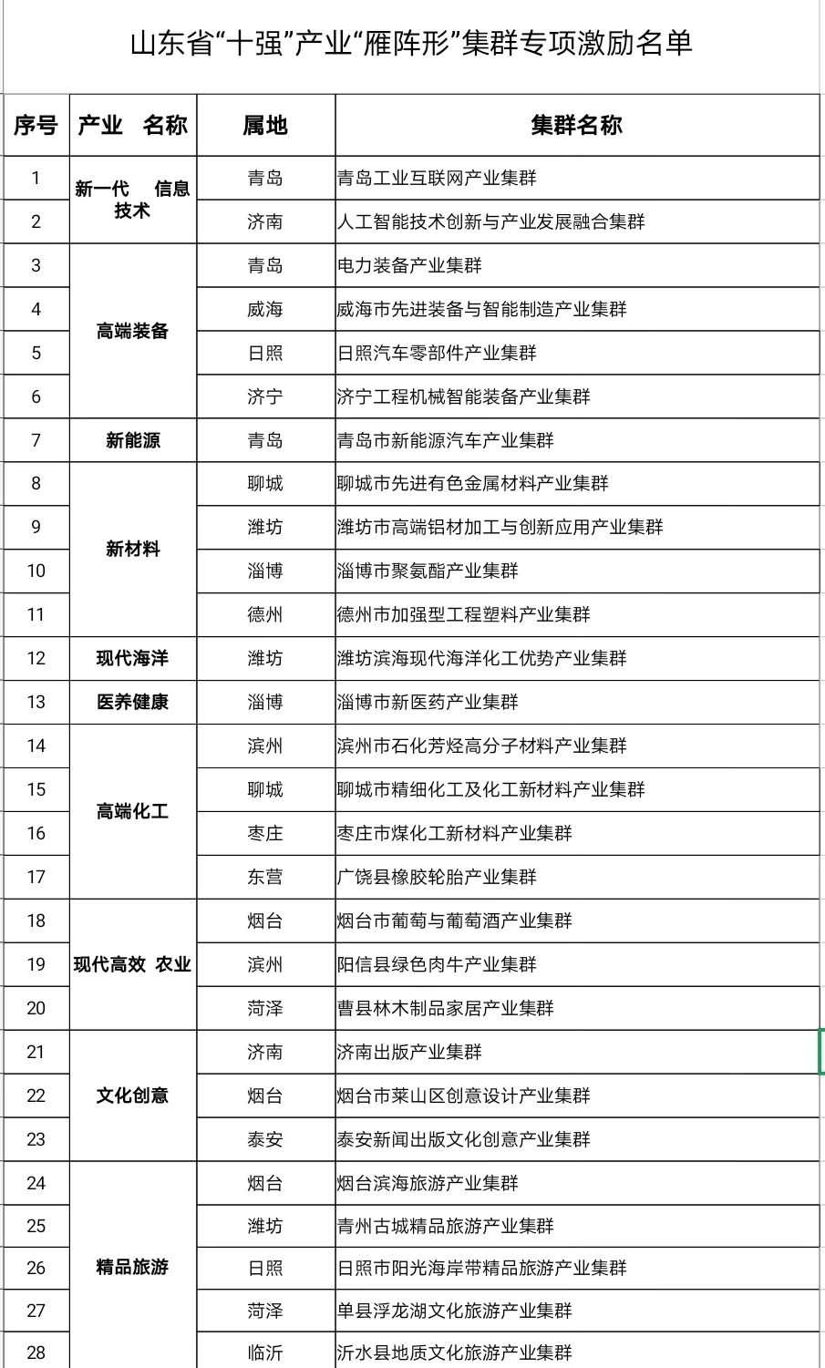 根據《“十強”產業“雁陣形”集群培育支持辦法》(魯發改重大辦〔2019〕458號)和《關于報送山東省“十強”產業“雁陣形”集群庫2020年度入庫產業集群發展情況的通知》,近期,省發展改革委會同有關部門組織開展了山東省“十強”產業集群領軍企業的評審工作,經各市申報、專班推薦、專家評審、綜合審查,并與有關部門溝通協商,擬對2020年度確定的省“十強”產業“雁陣形”集群給予專項激勵支持。現予以公示。歡迎社會各界參與監督,相關意見及建議請聯系山東省發展和改革委員會。對公示內容存在異議的,均可向省發展改革委書面提出,并提供必要的證明材料。個人反映請署本人真實姓名和聯系方式,單位反映請加蓋本單位公章。