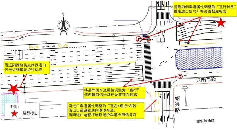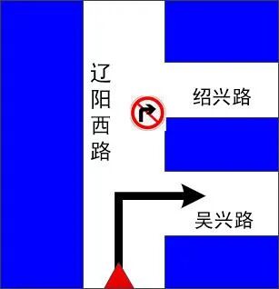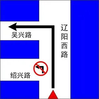 (3)將東進口最內側車道屬性調整為“直行掉頭”,借東進口信號燈桿設置禁止左轉標志牌,借遼陽西路永吉路東進口信號燈桿增設繞行提示標志;將西進口最外側車道屬性調整為“直行”,借西進口信號燈桿設置禁止右轉標志牌,借遼陽西路吳興路西進口信號燈桿設置繞行標志,提醒市民提前繞行。