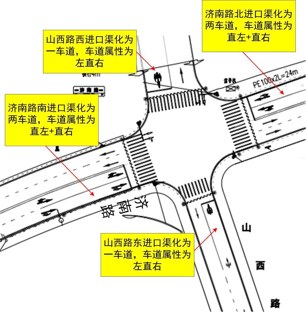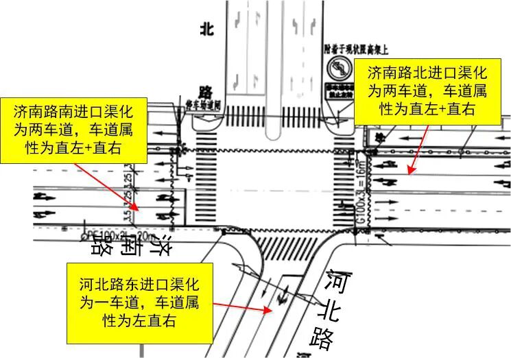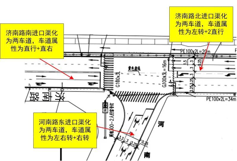 2、濟南路滄口路北進口渠化兩車道,車道屬性為“直左+直行”;南進口渠化為兩車道,車道屬性為“直右+右轉”;