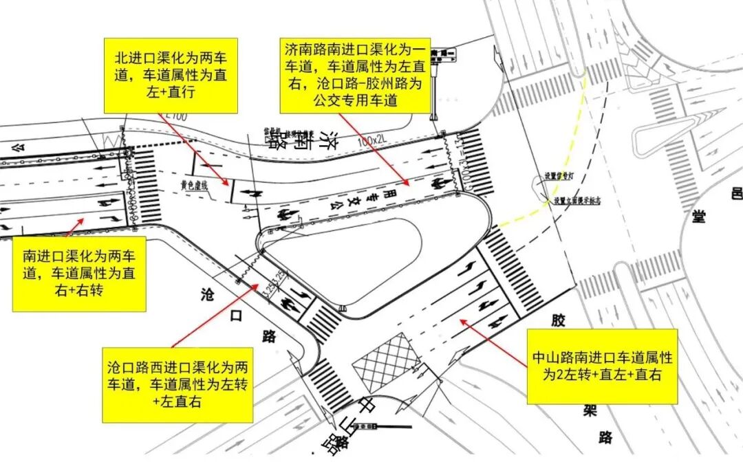 1、中山路南進口渠化四車道,車道屬性為“2左轉+直左+直右”;濟南路南進口渠化一車道,車道屬性為“左直右”,濟南路(滄口路-膠州路)路段為公交專用車道;