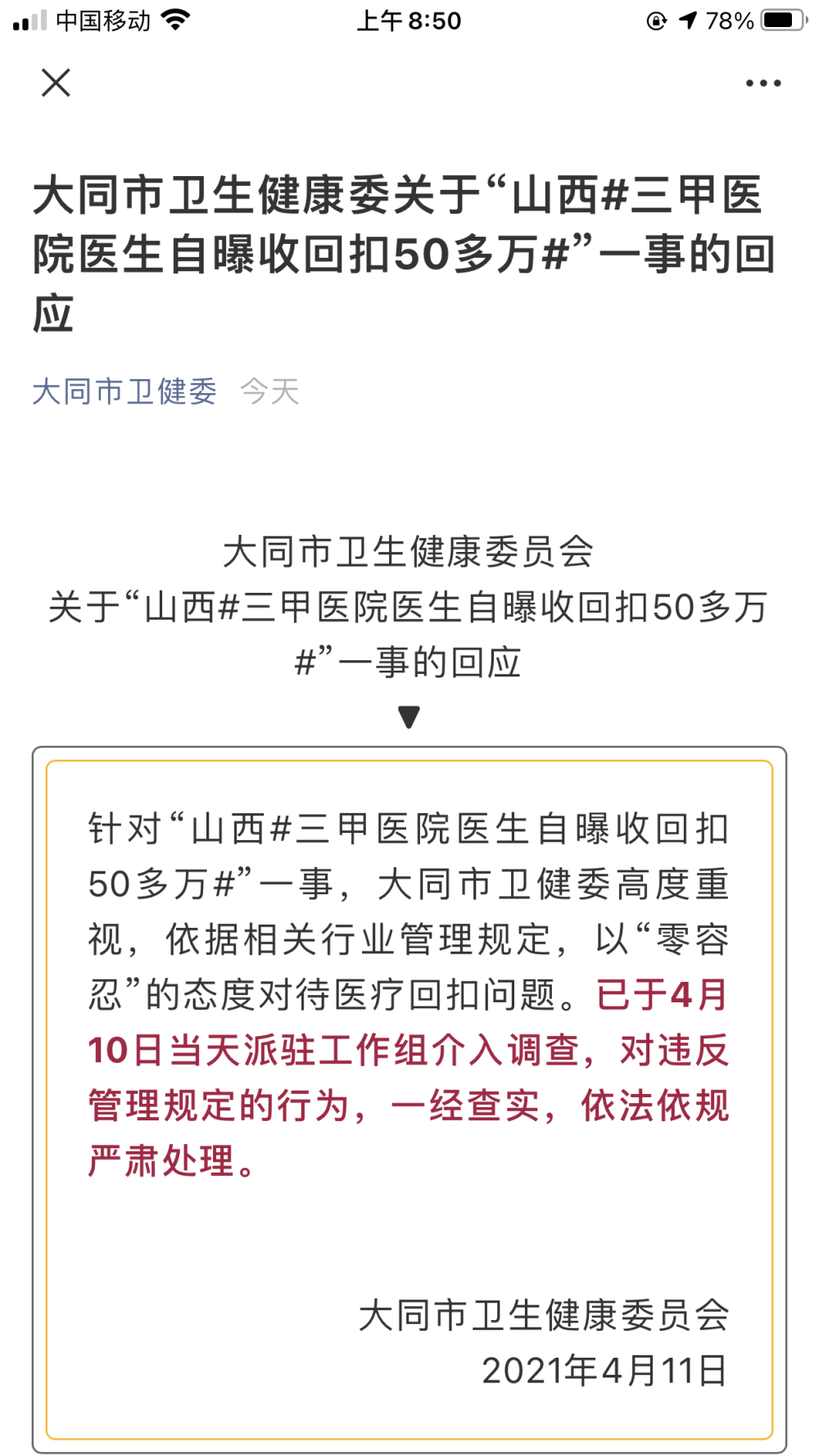 大同市衛生健康委關于“山西三甲醫院醫生自曝收回扣50多萬”一事的回應