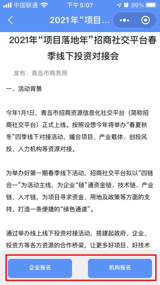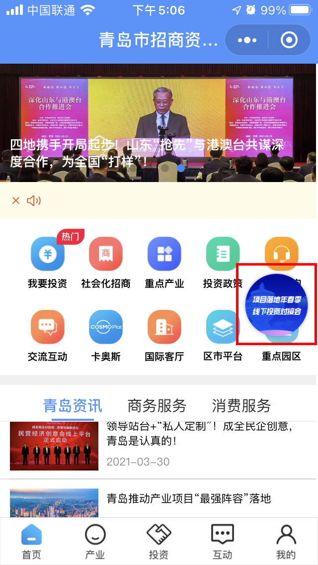 1、進入文末小程序“創(chuàng)業(yè)青島”青島市招商資源信息化社交平臺;