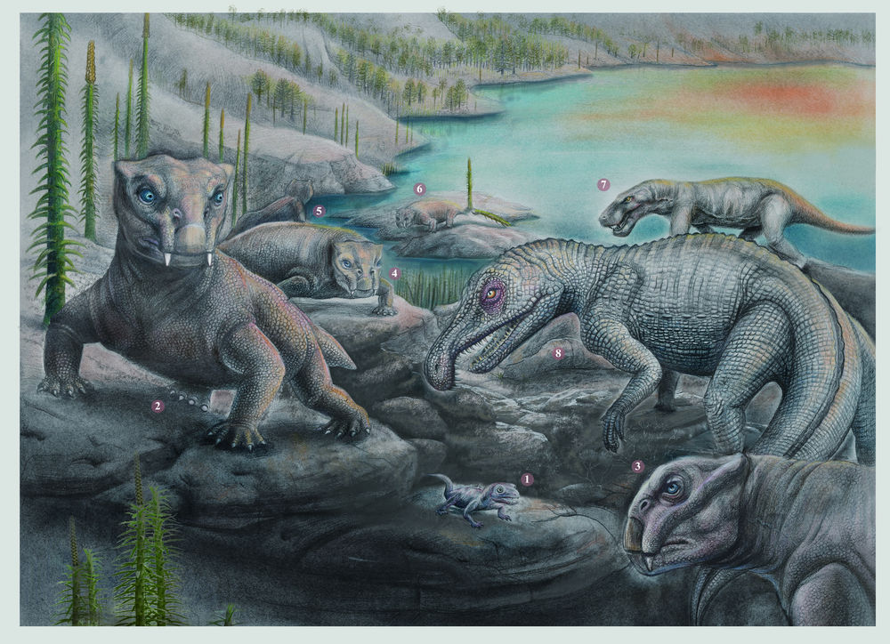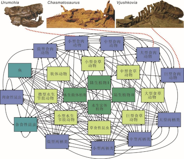 研究中的古食物網由植物、軟體動物、生活在湖泊中的昆蟲、魚類、兩棲類和四足動物構成。這些四足動物小到蜥蜴類、大到巨型植食性動物,其中也包含掠食者。當這些動物滅絕后,接下來的1000多萬年間,沒有生物接替它們的位置,從而形成了極不穩定、脆弱的陸地生態系統。此后,恐龍和哺乳動物在三疊紀晚期開始出現。