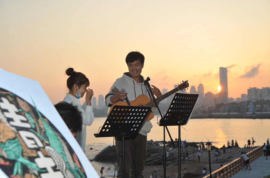 “我感覺青島真好,太浪漫了!我也想上去唱首歌。”很多來到小麥島的外地人,路過這里聽到他們在唱歌,也想上去來一首,還有喜歡跳探戈的觀眾,聽著聽著就跳了起來……