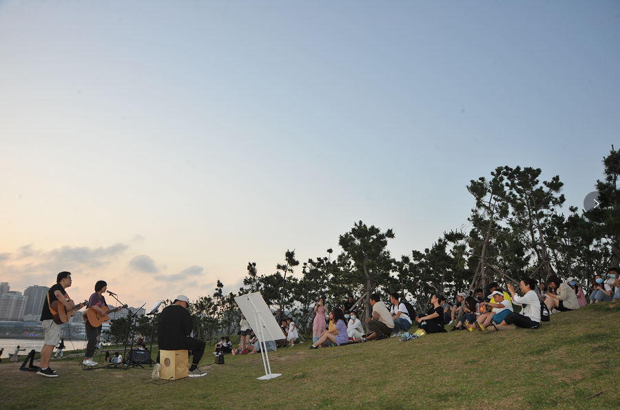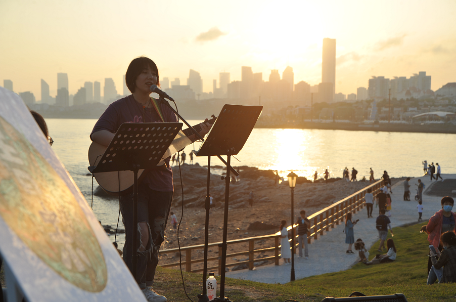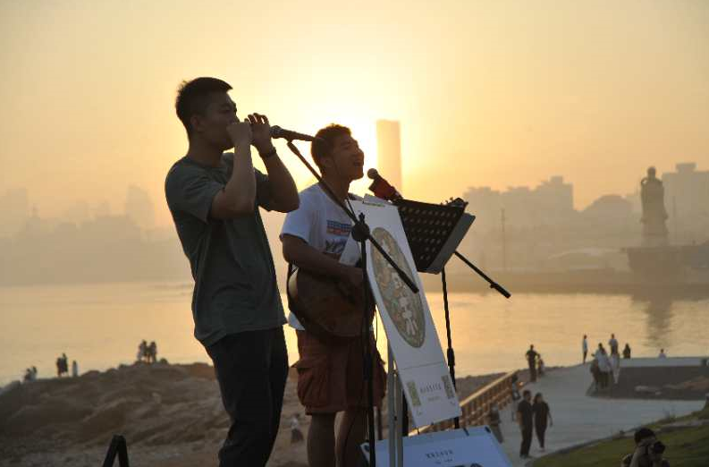 成立之初小篷車每周六會有自己的演出,與其說是演出不如說是他們給自己創造了一個鍛煉、學習的小型聚會,之前的聚會地點是不固定的,商場、酒吧、農場都有他們的身影。今年開始,他們把聚會的地點定在了小麥島,草坪上簡單的幾塊野餐布,沒有過于復雜的音響設備和絢麗的燈光,只有樂器彈奏的聲音和沁人心脾的歌聲,路過的人都想停下來,伴著海風一起,聽聽歌,聊聊天,享受浪漫的傍晚時光。