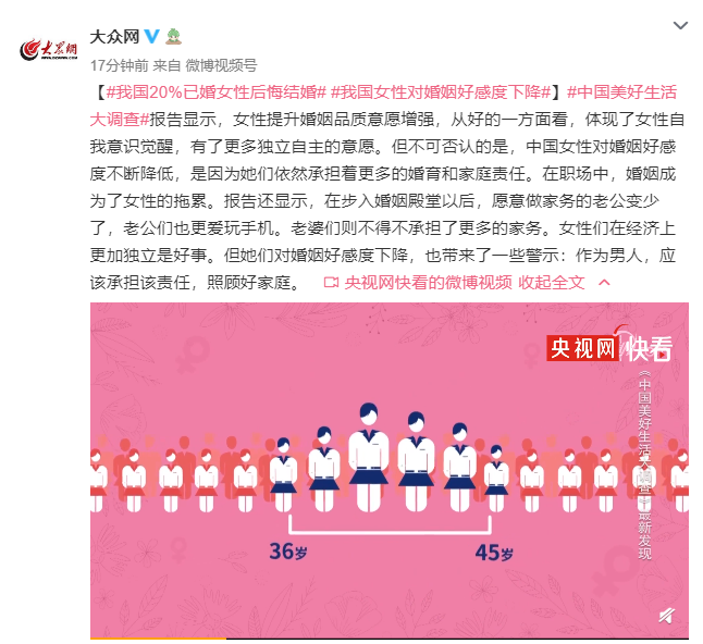 中國美好生活大調(diào)查報告顯示,女性提升婚姻品質(zhì)意愿增強,從好的一方面看,體現(xiàn)了女性自我意識覺醒,有了更多獨立自主的意愿。但不可否認的是,中國女性對婚姻好感度不斷降低,是因為她們依然承擔著更多的婚育和家庭責任。在職場中,婚姻成為了女性的拖累。報告還顯示,在步入婚姻殿堂以后,愿意做家務的老公變少了,老公們也更愛玩手機。老婆們則不得不承擔了更多的家務。女性們在經(jīng)濟上更加獨立是好事。但她們對婚姻好感度下降,也帶來了一些警示:作為男人,應該承擔該責任,照顧好家庭。