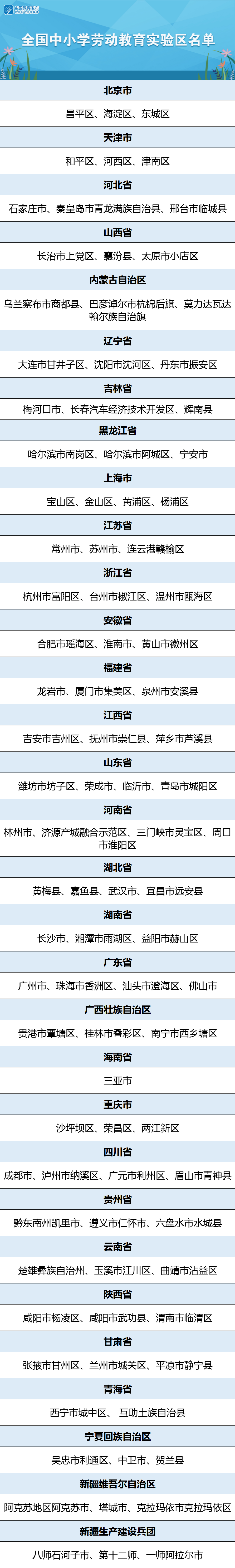 近日,教育部發(fā)布公示,擬認(rèn)定96個(gè)縣區(qū)(市)作為全國(guó)中小學(xué)勞動(dòng)教育實(shí)驗(yàn)區(qū),公示時(shí)間為4月21日—4月28日。公示名單如下: