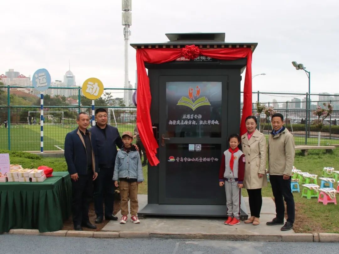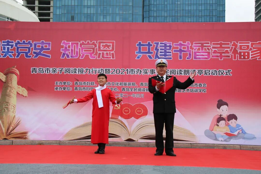 最后,青島市婦兒活動中心負責人吳曉謙和青島市廣播電視臺新聞中心全媒體節目部副主任孫彬與書香家庭一起,為“童閱島”朗讀亭揭幕,標志著青島市親子家庭讀黨史活動暨2021市辦實事全民閱讀朗讀亭正式啟動。