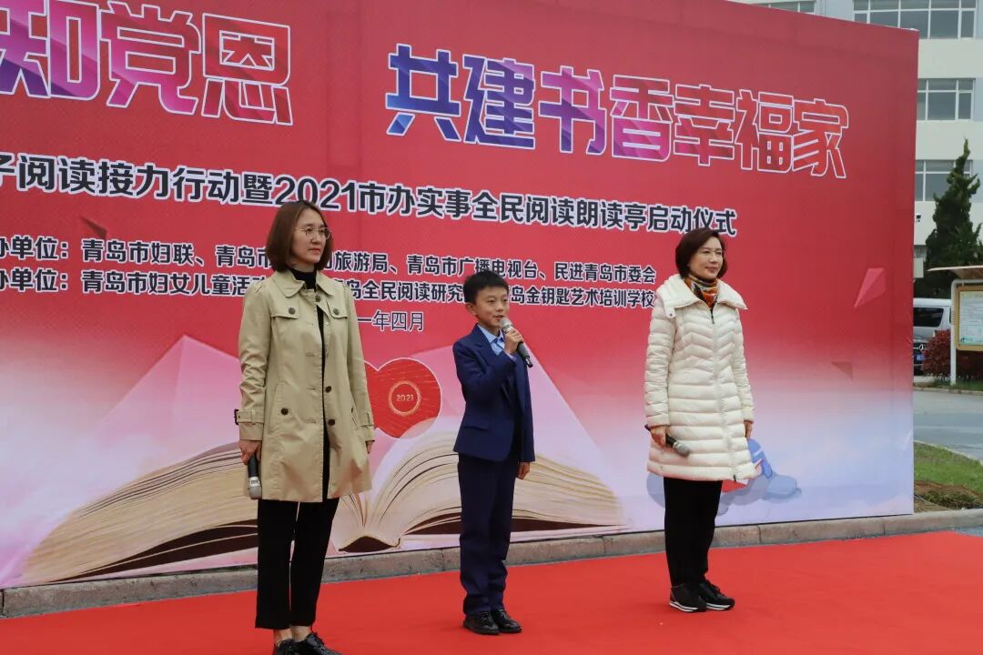 儀式上,青島市婦聯副主席魏魯華致辭。市婦聯一直倡導和參與全民閱讀活動。以慶祝建黨100周年主題,與市文旅局、市廣播電視臺、民進青島市委會共同推動青島市親子閱讀接力行動,落地2021市辦實事全民閱讀朗讀亭,是開展黨史教育的一項重要內容。是體現家庭親子特色,體現好家風,引領好家教,建設好家庭的具體舉措。市婦聯所屬市婦兒中心發揮陣地作用,開展豐富多彩的閱讀活動,讓朗朗誦讀之聲傳遍島城,推動全民閱讀活動在婦女兒童的陣地生根發芽,成為廣大家庭傳播、交流、展示讀書之樂的平臺。歡迎更多的家庭關注、參與閱讀行動,以書香浸潤好家庭,以書香涵養好家庭,以書香引領好家風,共建書香幸福家庭。