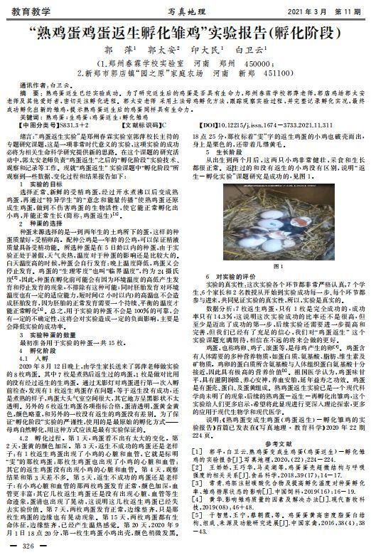 澎湃新聞注意到,前述實驗目標,被稱作“雞蛋返生”,出自《“熟雞蛋雞蛋返生孵化雛雞”實驗報告(孵化階段)》一文,由鄭州春霖學校實驗室和新鄭市郭店“園之原”家庭農場發表在刊物《寫真地理》2021年3月第11期。作者為郭萍、郭太安、印大民、白衛云,其中白衛云為通訊作者。