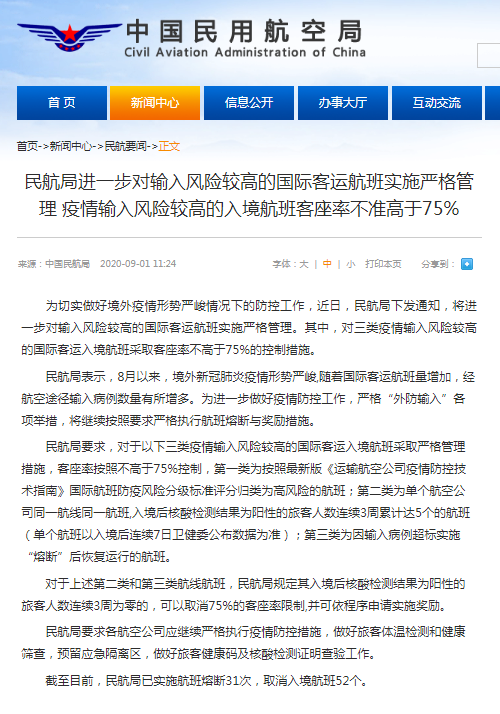 民航局表示,8月以來,境外新冠肺炎疫情形勢嚴峻,隨著國際客運航班量增加,經航空途徑輸入病例數量有所增多。為進一步做好疫情防控工作,嚴格“外防輸入”各項舉措,將繼續按照要求嚴格執行航班熔斷與獎勵措施。