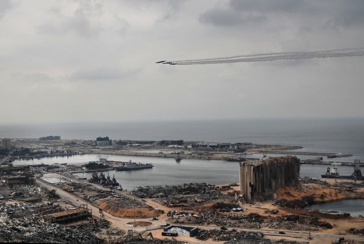 9月1日,在黎巴嫩貝魯特,“法蘭西巡邏兵”飛行表演隊從港口爆炸區域上空飛過。新華社/美聯