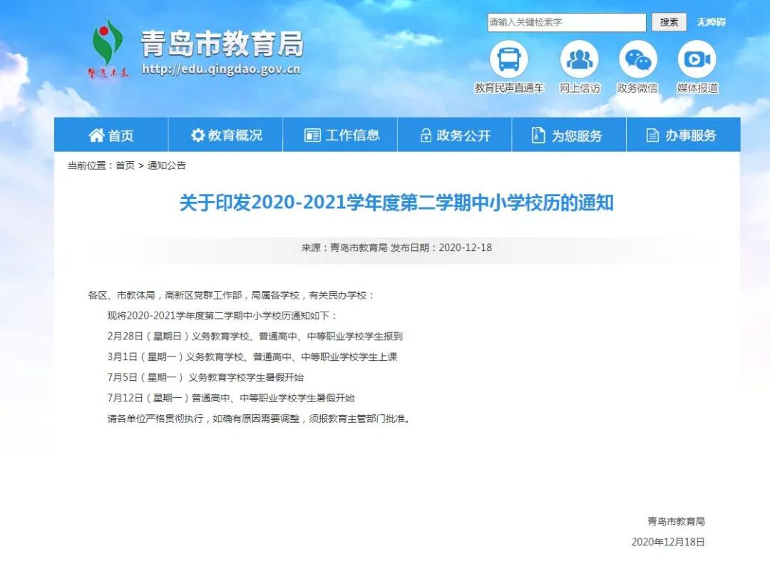 此前,青島市教育局發布過2020-2021學年度第二學期中小學校歷的通知