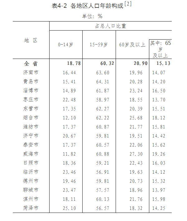 16個市中,15-59歲人口比重在60%以上的市有9個,65歲及以上老年人口比重超過14%的市有14個。其中,青島65歲及以上人口比重為14.20%,較2010年(10.26%)提高3.94個百分點,低于全省0.93個百分點。