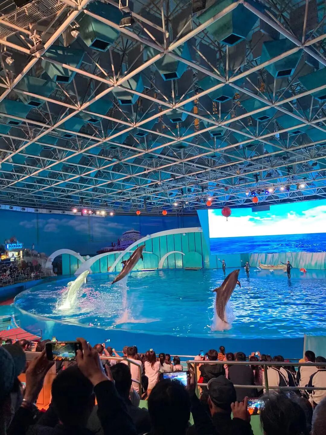 三只深褐色的海豚,齊刷刷的亮相,惹動了全場的歡呼,一會兒載著訓導員,乘風破浪,一會兒潛游水底,迅捷如風,聰明的小海豚,頭頂呼啦圈,不斷的旋轉,輕靈的身姿令同學們看得如癡如醉。最精彩的是,它們依次從水中彈身而上,用自己的鼻尖輕觸懸掛在頂棚的紅色氣球,全場爆發出雷鳴般的掌聲、歡呼聲!
