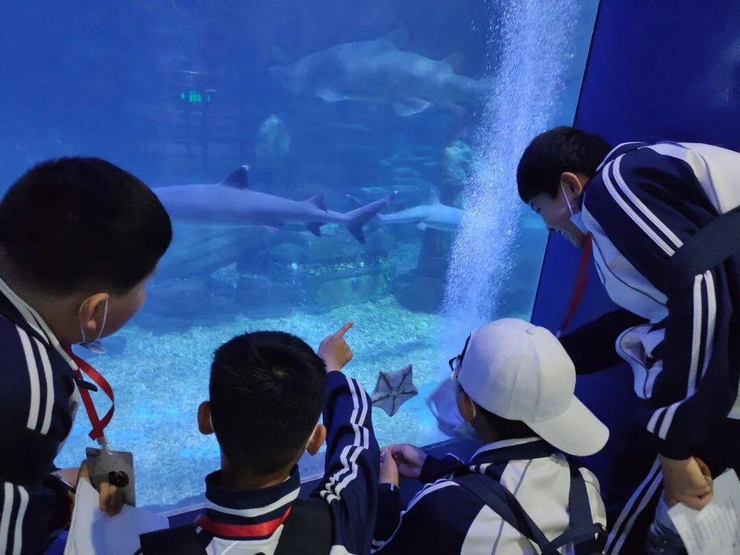 啊,鯊魚!同學們一片驚呼,只見它們靜靜地游弋,與日常聽聞的可怕兇殘根本不沾邊,各走各的路,各行各的道,和諧相處,這讓同學們大開眼界!