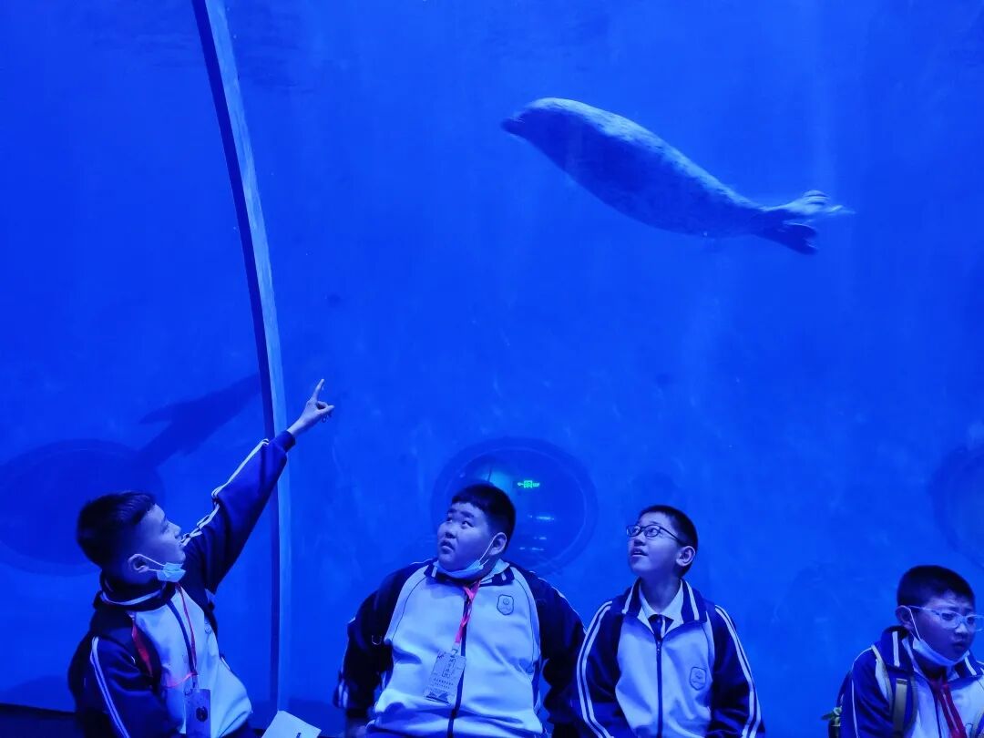 海水中,圓滾滾的海獅海豹自如的反轉著身軀,一會兒上,一會兒下,其靈活性令同學們贊嘆。