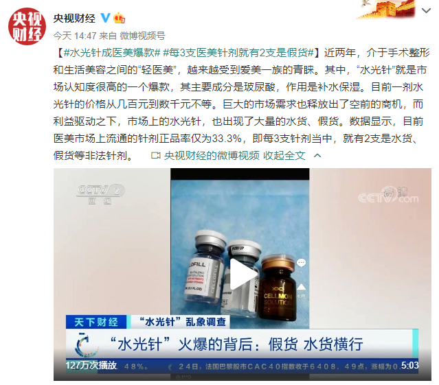 近兩年,介于手術整形和生活美容之間的“輕醫美”,越來越受到愛美一族的青睞。其中,“水光針”就是市場認知度很高的一個爆款,其主要成分是玻尿酸,作用是補水保濕。目前一劑水光針的價格從幾百元到數千元不等。巨大的市場需求也釋放出了空前的商機,而利益驅動之下,市場上的水光針,也出現了大量的水貨、假貨。數據顯示,目前醫美市場上流通的針劑正品率僅為33.3%,即每3支針劑當中,就有2支是水貨、假貨等非法針劑。