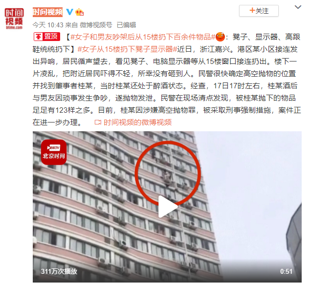 【女子和男友吵架后從15樓扔下百余件物品:凳子、顯示器、高跟鞋統統扔下】近日,浙江嘉興。港區某小區接連發出異響,居民循聲望去,看見凳子、電腦顯示器等從15樓窗口接連扔出。樓下一片凌亂,把附近居民嚇得不輕,所幸沒有砸到人。民警很快確定高空拋物的位置并找到肇事者桂某,當時桂某還處于醉酒狀態。經查,17日17時左右,桂某酒后與男友因瑣事發生爭吵,遂拋物發泄。民警在現場清點發現,被桂某拋下的物品足足有123樣之多。目前,桂某因涉嫌高空拋物罪,被采取刑事強制措施,案件正在進一步辦理。