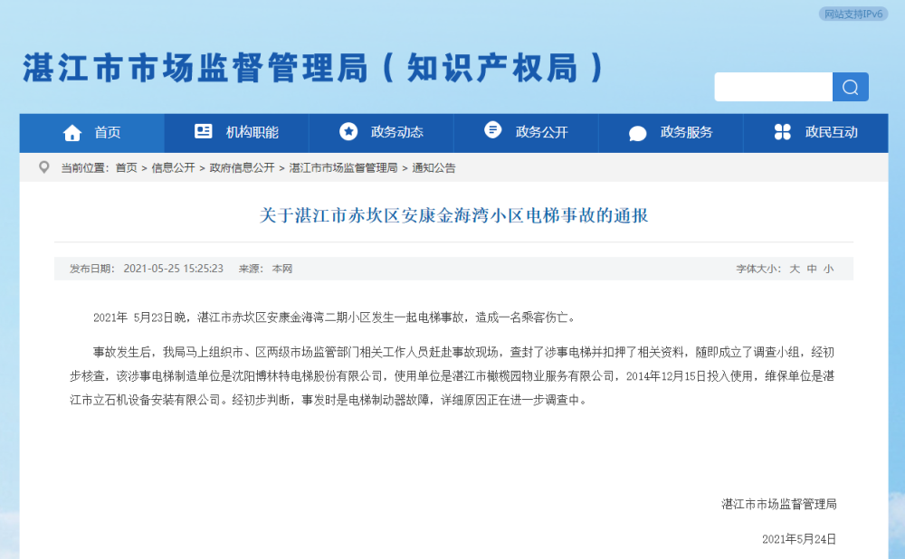 事故發(fā)生后,我局馬上組織市、區(qū)兩級(jí)市場監(jiān)管部門相關(guān)工作人員趕赴事故現(xiàn)場,查封了涉事電梯并扣押了相關(guān)資料,隨即成立了調(diào)查小組,經(jīng)初步核查,該涉事電梯制造單位是沈陽博林特電梯股份有限公司,使用單位是湛江市橄欖園物業(yè)服務(wù)有限公司,2014年12月15日投入使用,維保單位是湛江市立石機(jī)設(shè)備安裝有限公司。經(jīng)初步判斷,事發(fā)時(shí)是電梯制動(dòng)器故障,詳細(xì)原因正在進(jìn)一步調(diào)查中。