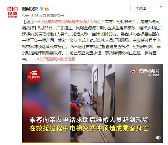湛江一小區(qū)電梯突然加速撞向頂樓1人身亡 官方:經(jīng)初步判斷,是電梯制動(dòng)器故障