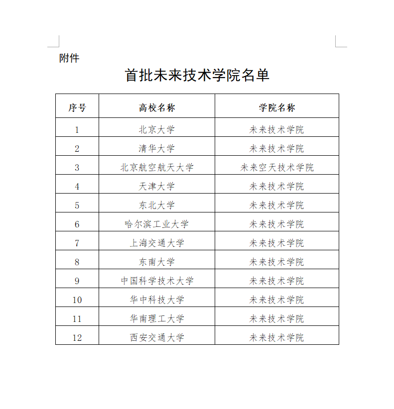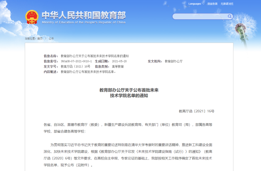 為貫徹落實習近平總書記關于教育的重要論述特別是在清華大學考察時的重要講話精神,推進新工科建設全面深化,加快未來技術學院建設,根據《教育部辦公廳關于印發〈未來技術學院建設指南(試行)〉的通知》(教高廳函〔2020〕6號)等文件要求,在高校自主申報、專家論證的基礎上,我部按相關工作程序確定了首批未來技術學院名單,現予公布(見附件)。