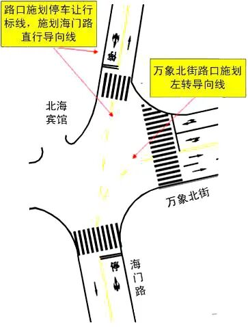 1、海門路南、北進(jìn)口施劃停車讓行線和直行導(dǎo)向線;
